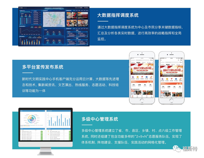 安徽福斯特信息技術有限公司持續助力新時代文明實踐中心建設,充分利用大數據、云計算、移動互聯網等新一代信息技術,打造新時代文明實踐中心云平臺,完善平臺動員、整合、引導、服務、創新和保障能力,實現新時代文明實踐中心的可持續運營。